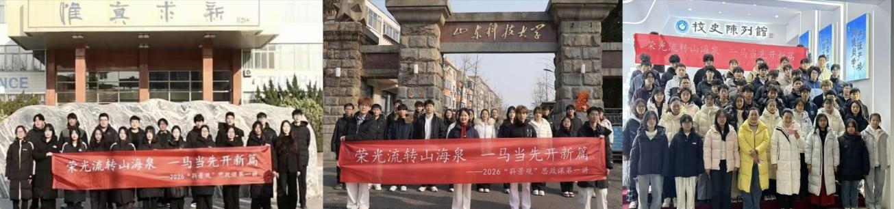 1月4日,新年首个工作日,山东科技大学2026年“嵙景观”思政课第一讲开讲。课程以“荣光流转山海泉,一马当先开新篇”为主题,首次运用网络直播、三地联动的方式,打破空间壁垒,从云端将泰安、济南、青岛校区纳入“山科大思政”的教育实践全过程。其中,青岛校区化工学院团委书记兼学工办主任易凡担任主讲,泰安校区由智能装备学院辅导员杨文园担任主讲,济南校区由辅导员卓国梁和基础课部教授贺建芹联袂主讲。化工学院辅导员李玲玲老师、心健联成员代表及三校区学生党员共200余名学生代表参与了此次课程。这堂课以回望校史、展望新年的方式,让思政教育走出教室、融入场景、走进心灵,为新一年思政教育工作写下生动开篇。
