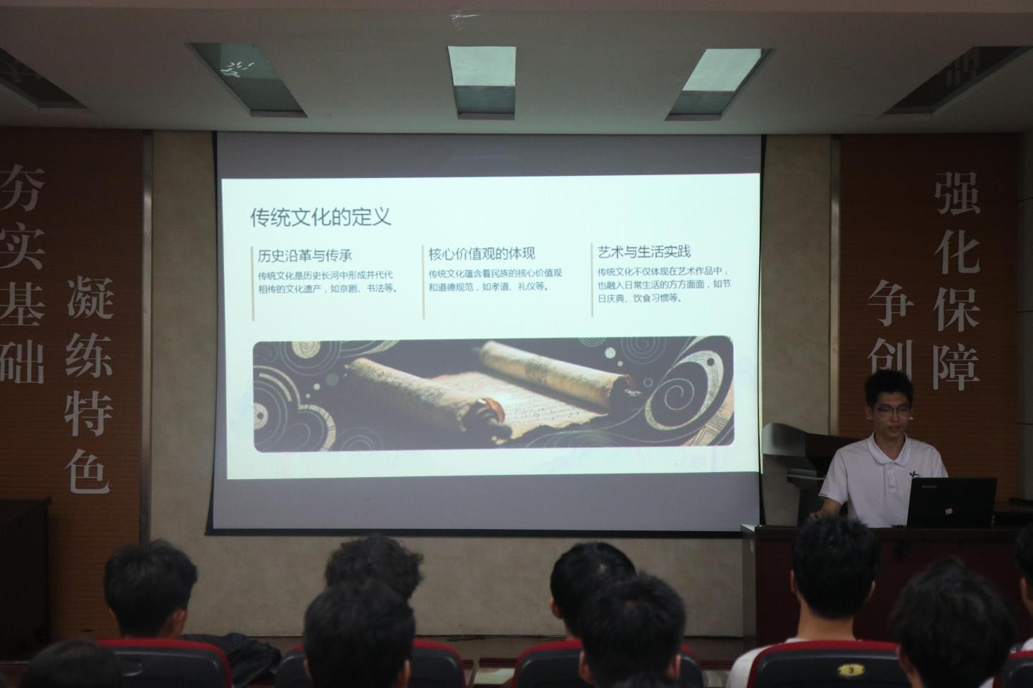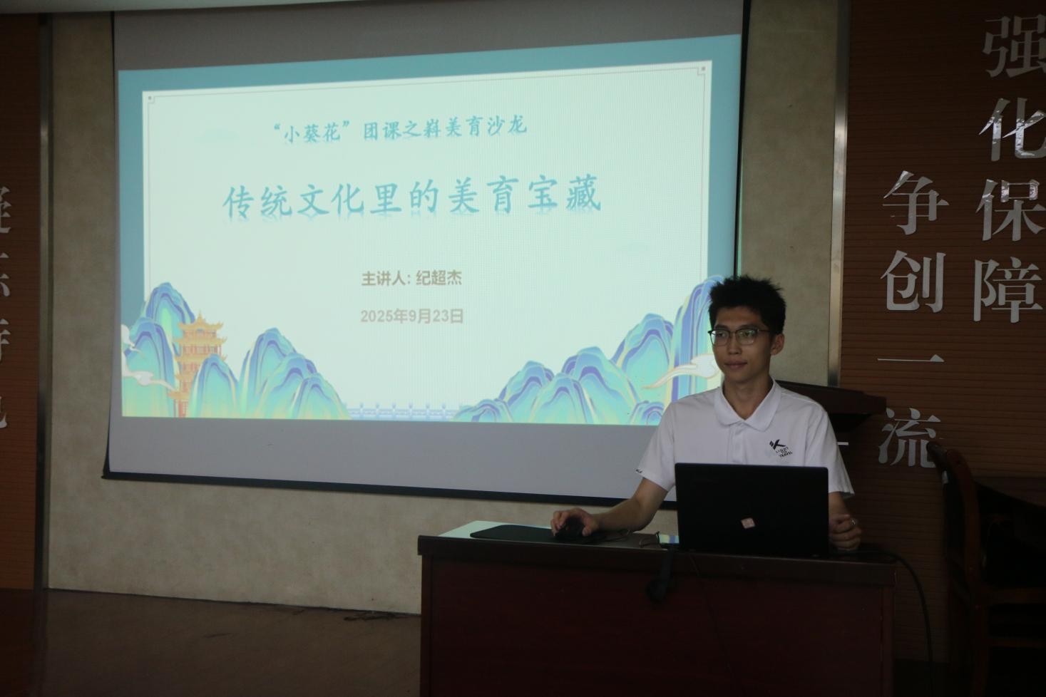 2025年9月23日,化工学院“小葵花”主题团课之嵙美育沙龙在J2-104开班,作为该系列主题团课的第一讲,此次课程的主题是“传统文化里的美育宝藏”,由学生会执行主席纪超杰主讲,全体学生会成员参加。
