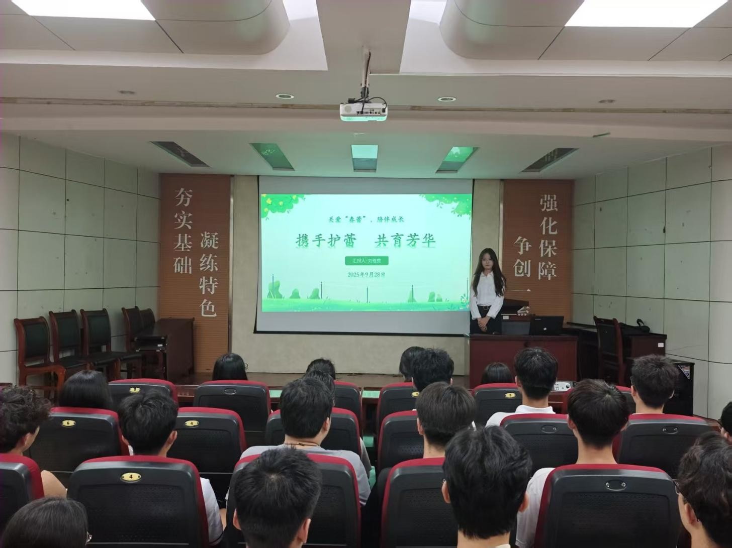 2025年9月28日,化工学院“关爱‘春蕾’,陪伴成长”主题团课在J2-104召开,作为该系列主题团课的第二讲,此次课程的主题是“携手护蕾 共育芳华”,由“护蕾”志愿者刘雅雯主讲,全体学生会成员参加。