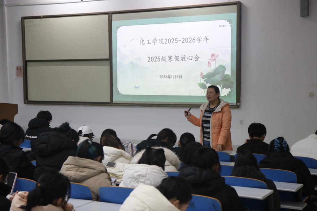 寒假将至,为确保全体学生度过一个平安、祥和的假期,化工学院于1月8日召开2025级本科生寒假放心会。本次会议由2025级本科生辅导员李玲玲老师主讲,大一全体学生参加。