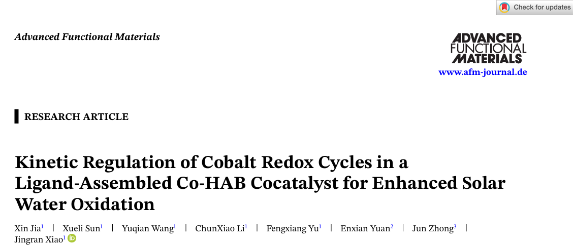 近日,化工学院肖静冉(学术教授)等人在光电催化水分解领域取得重要进展,相关成果以“Kinetic Regulation of Cobalt Redox Cycles in a Ligand-Assembled Co-HAB Cocatalyst for Enhanced Solar Water Oxidation”为题发表在国际知名学术期刊《Advanced Functional Materials》上(中科院一区Top,影响因子:19),该文章第一作者为化工学院2023级硕士研究生贾鑫。